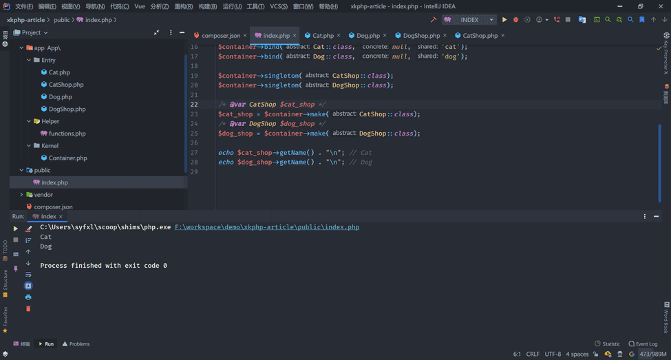 echo $dog_shop->getName() . "\n"; // Dog添加完毕后就可以进行测试了,运行 index.php: